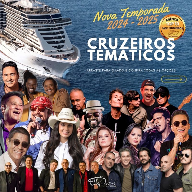 Confira os navios dos seus artistas favoritos e realize sua viagem com o suporte dos especialistas em cruzeiros da ELLE PRIME VIAGENS. Conheça os navios temáticos que vão rolar durante as próximas temporadas, no Brasil e no exterior.